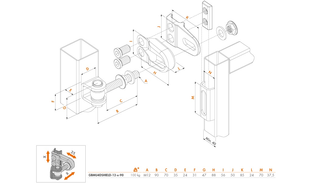 LOCINOX® GBMU4DSHIELD navárací záves M12, otvárateľný 180°, nastaviteľný 3D, zvýšená bezpečnosť, čiastočne pozinkovaný