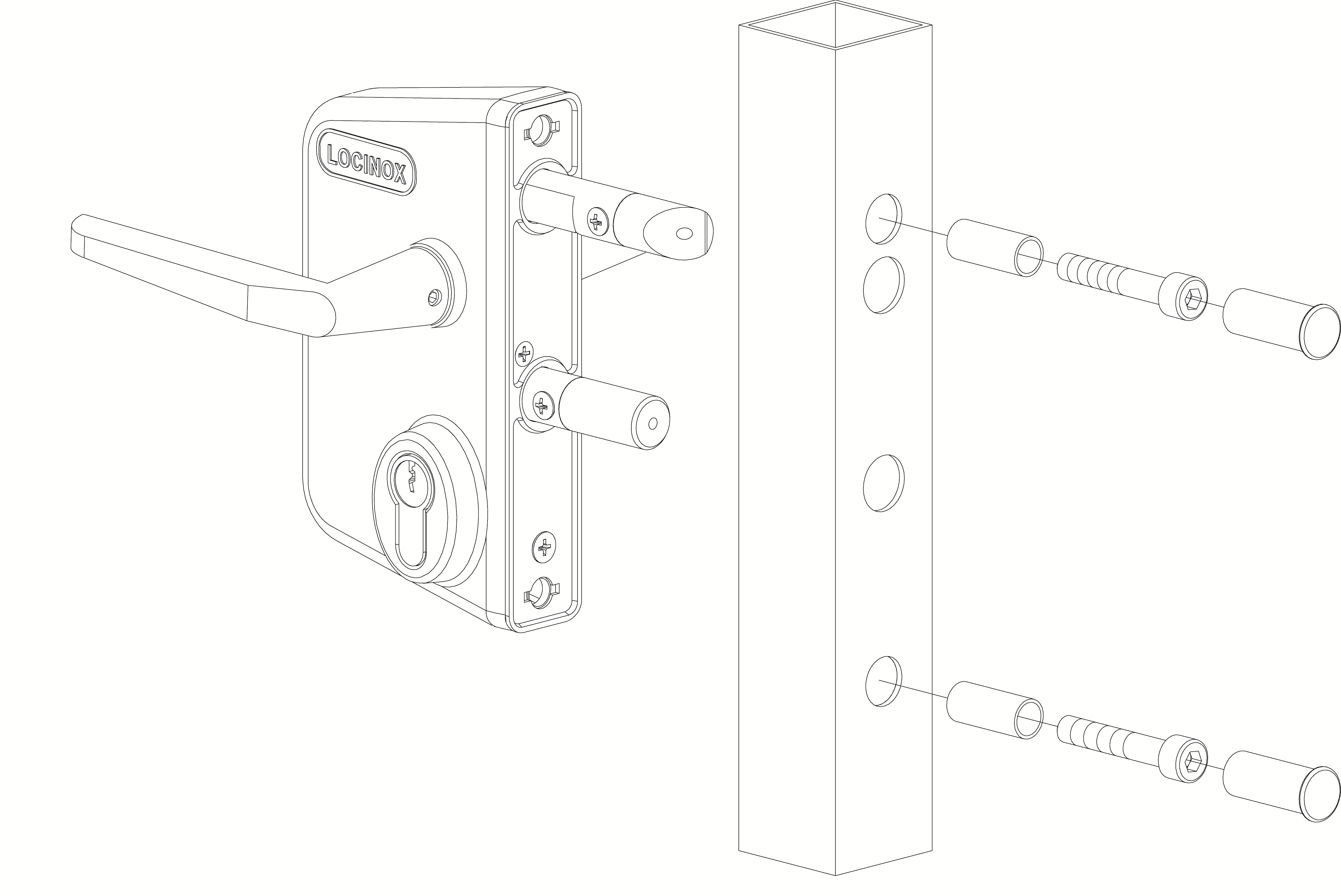 Dodávané s párom kľučiek LOCINOX® 3006M z eloxovaného hliníka a cylindrickou vložkou LOCINOX® 3012-54-STD.
